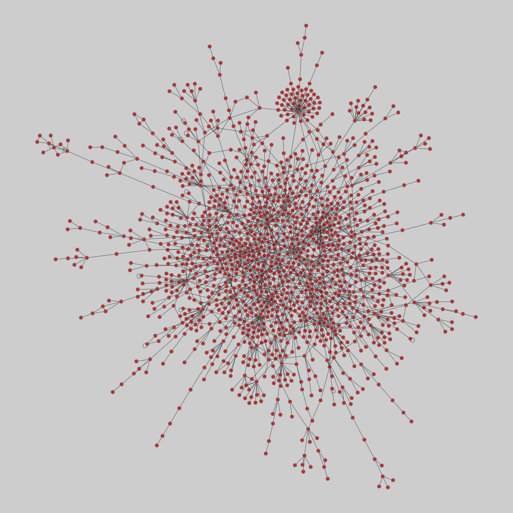 A network of protein-protein binding interactions among yeast proteins. Nodes represent proteins found in yeast (Saccharomyces cerevisiae) and an edge represents a binding interaction between two proteins.1
